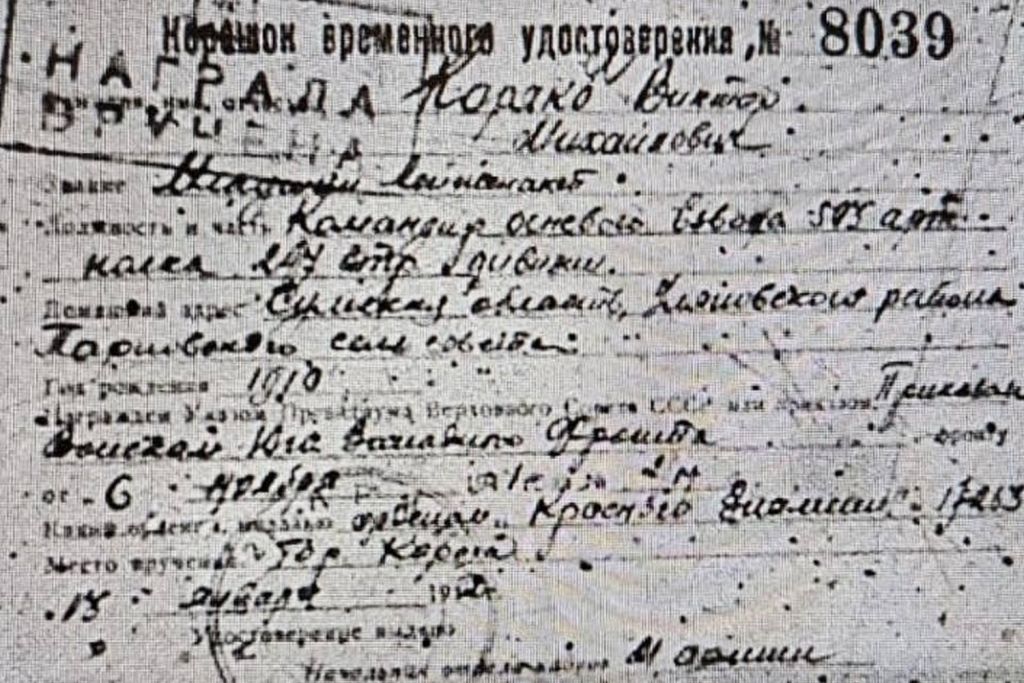 Фото: отряда «Поиск» Теперь награда будет храниться в музее Боевой славы – Виктор Коряко является уроженцем Ульяновского района Сумской области, и сейчас отыскать его родственников для передачи личных вещей и останков не представляется возможным. Поисковики также идентифицировали другого командира – младшего лейтенанта Сергея Грачёва, чьи данные сохранились на личной ложке: «Грачев А.С., ХАУ. Белёв, 1941 год. Фергана, 1942 год».