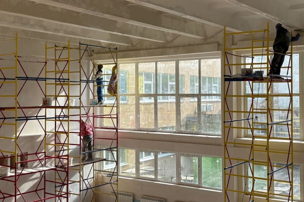 Фото: пресс-служба администрации округа Одновременно ведутся работы по обустройству актового и спортивного залов. В первом собирают новую сцену, а во втором – готовят поверхности под финишную отделку. На прилегающей территории уже построены стадион и спортивные площадки, начался монтаж малых архитектурных форм.